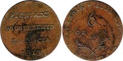 - rewers: nominał „6”, pod nim napis „GROSZY”, poniżej dwie skrzyżowane gałązki, dookoła napis: „BOŻE DOPOMÓŻ WIERNYM OYCZYŹNIE”,