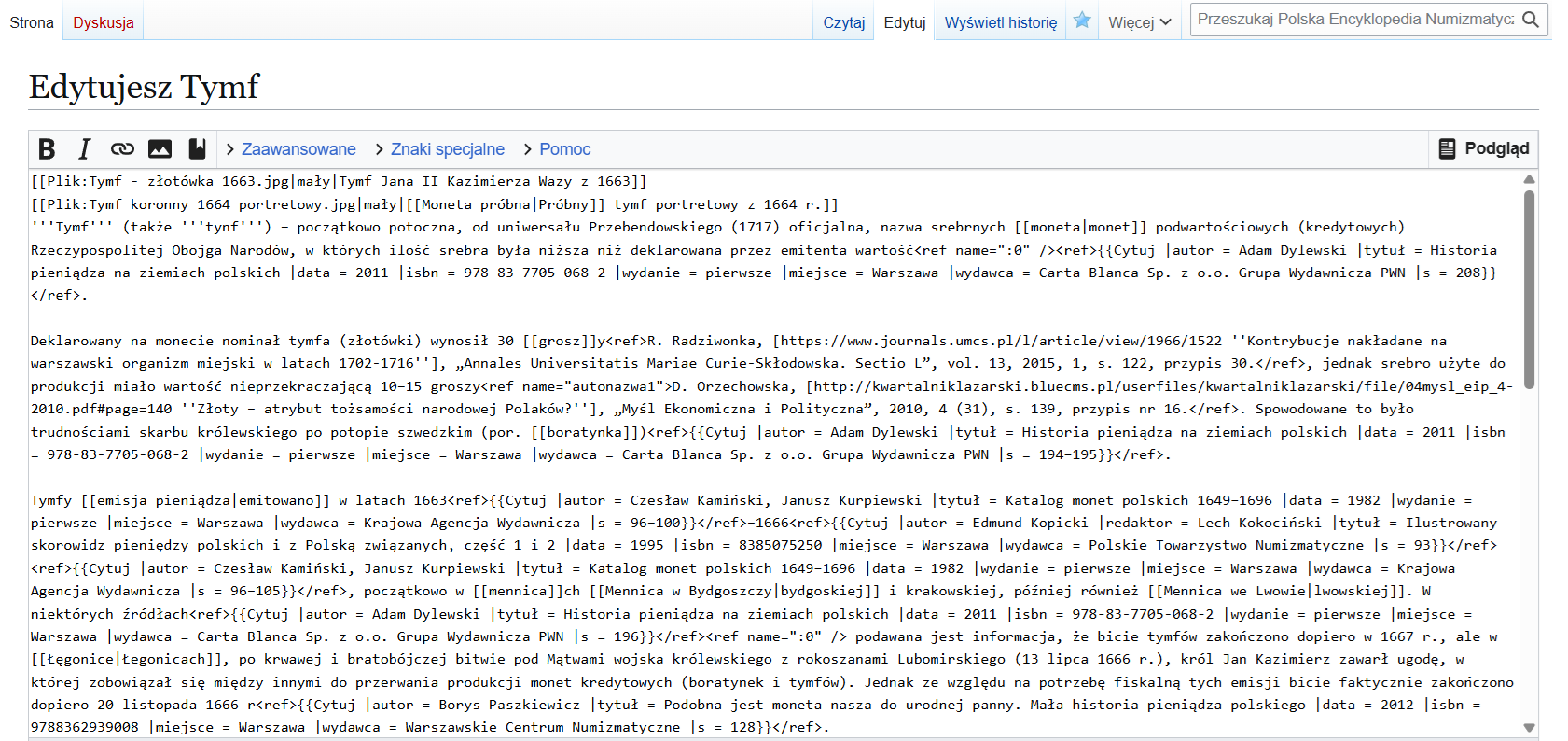| 14:52, 30 mar 2026 | Edytor.png (plik) | 241 KB | Okno edytora na przykładzie artykułu o tymfie. Na potrzeby PEN:Szybki wstęp do edycji. | 1 | |